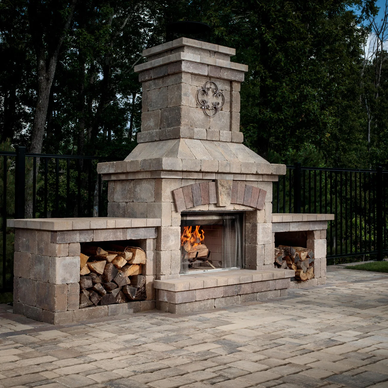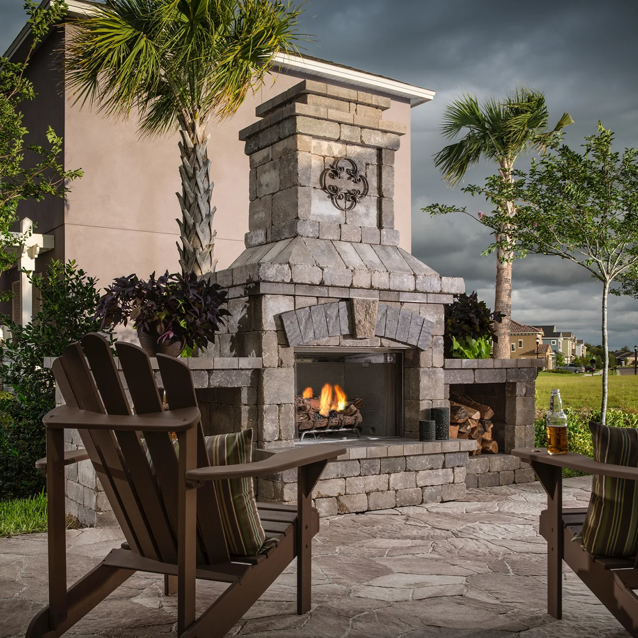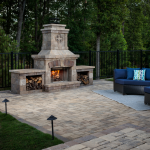 The  Outdoor Stone Fireplace addresses the need for a more affordable outdoor stone fireplace. Similar in styling to the Bristol™ Series, Brighton features the look of tumbled stone, but with simpler accents and a smaller footprint. Ideal for smaller spaces, the Brighton™ Series outdoor fireplace features the same 36″ firebox as the Bristol™ series and a built-in hearth with optional coordinating wood boxes.