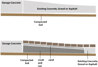 A layer of crush and run (a gravel made from crushed stone and stone dust) is installed on the newly excavated area, between the existing concrete driveway and garage/house concrete.