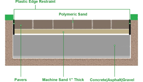 Then, a layer of machine sand is added on top of your concrete, gravel or asphalt for better drainage and stability. Once that’s done, edging is secured around the perimeter to keep the pavers in place.